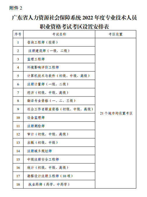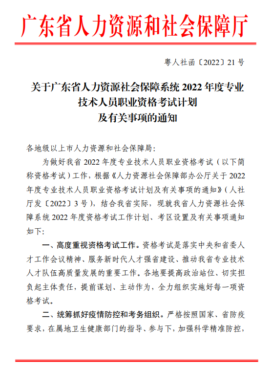 现将广东省人力资源和社会保障厅《关于广东省人力资源社会保障系统2022年度专业技术人员职业资格考试计划及有关事项的通知》(粤人社函〔2022〕21号)转发给你们,请配合做好以下相关工作。