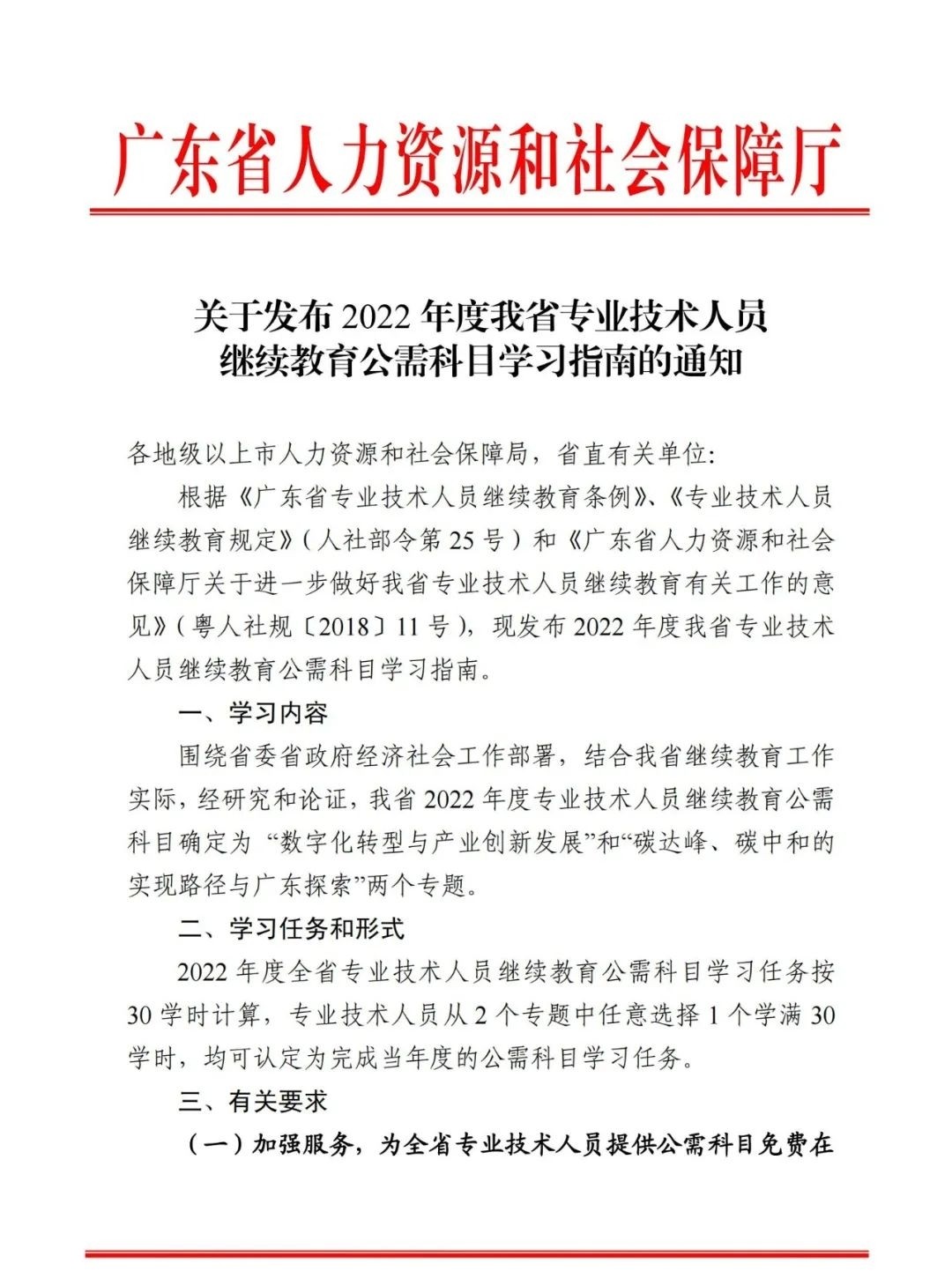 广东省2022年度专业技术人员继续教育公需科目确定为“数字化转型与产业创新发展”和“碳达峰、碳中和的实现路径与广东探索”两个专题。2022年度广东省专业技术人员继续教育公需科目学习任务按照30学时计算,专业技术人员从2个专题中任意选择1个学满30学时,均可认定为完成当年度的公需科目学习任务。