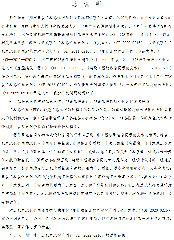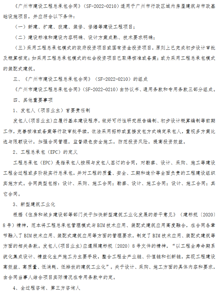 为贯彻落实《住房和城乡建设部 国家发展改革委关于印发房屋建筑和市政基础设施项目工程总承包管理办法的通知》(建市规〔2019〕12号),完善工程总承包合同管理,切实推进全过程工程咨询服务的全面发展,现结合近年省、市相关各项具体要求,广州市住房和城乡建设局、广州市市场监督管理局共同制定了《广州市建设工程总承包合同》(SF-2022-0210)示范文本,定于2022年6月1日起在全市使用。