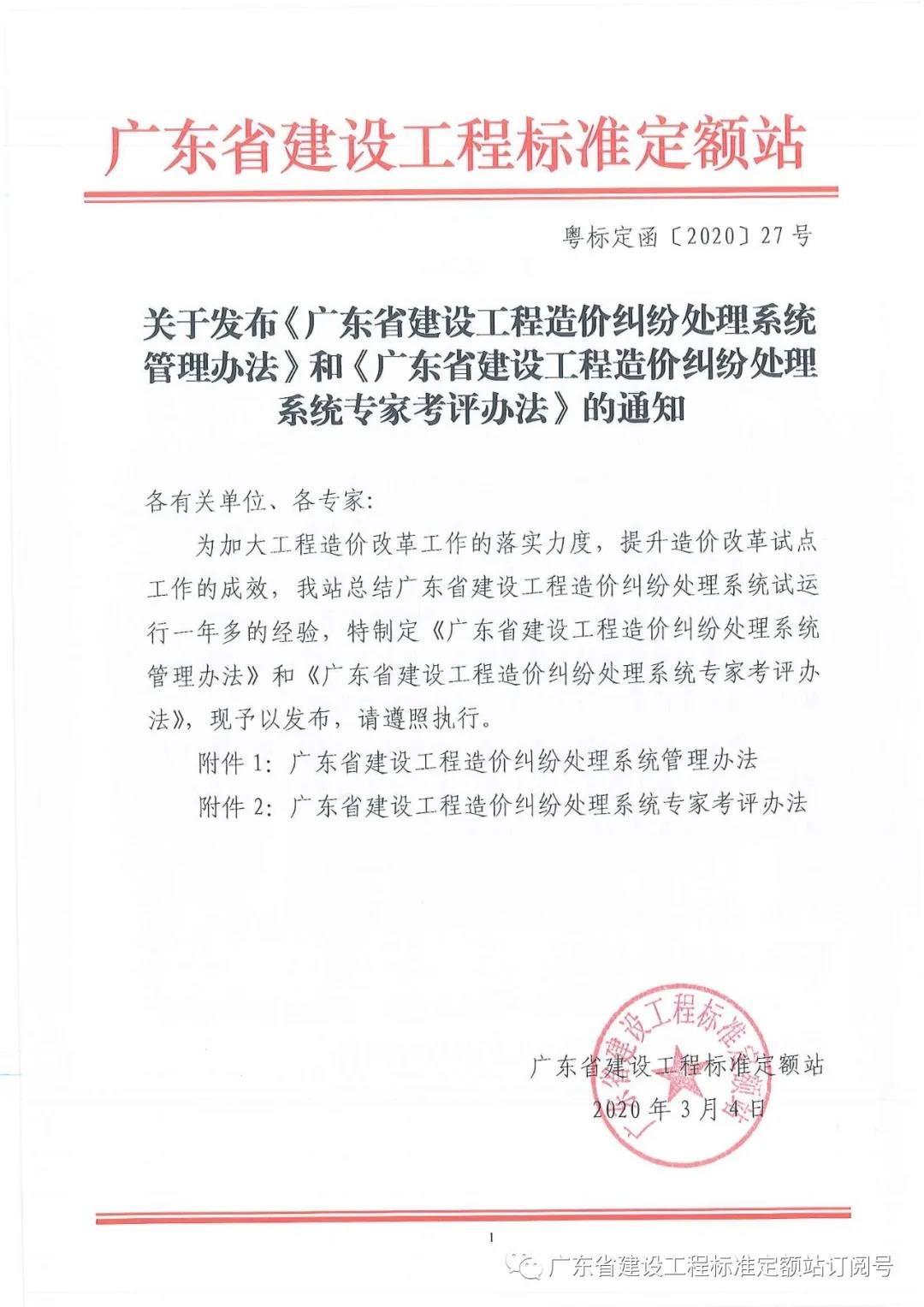 关于发布《广东省建设工程造价纠纷处理系统管理办法》和《广东省建设工程造价纠纷处理系统专家考评办法》的通知—粤标定函【2020】27号