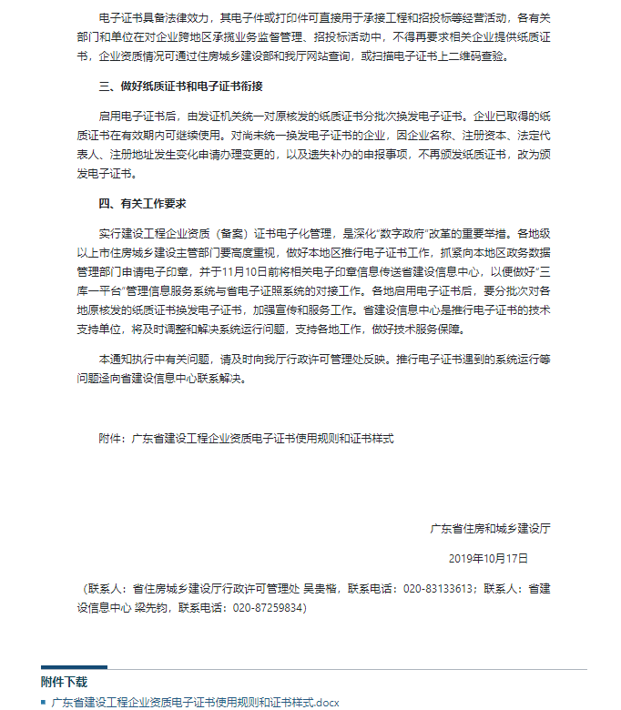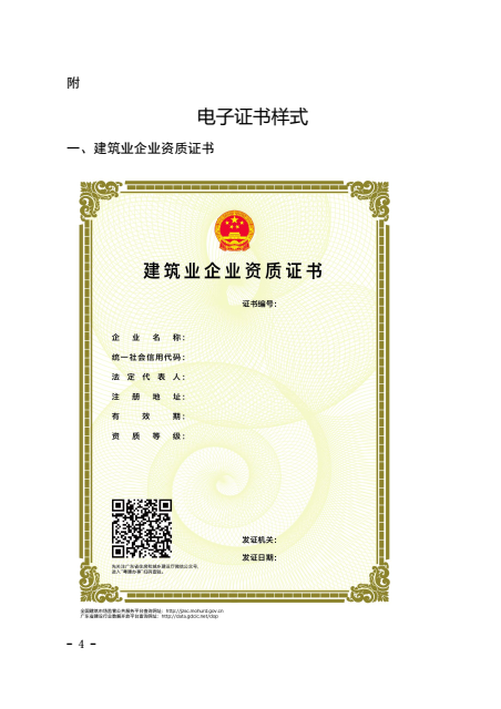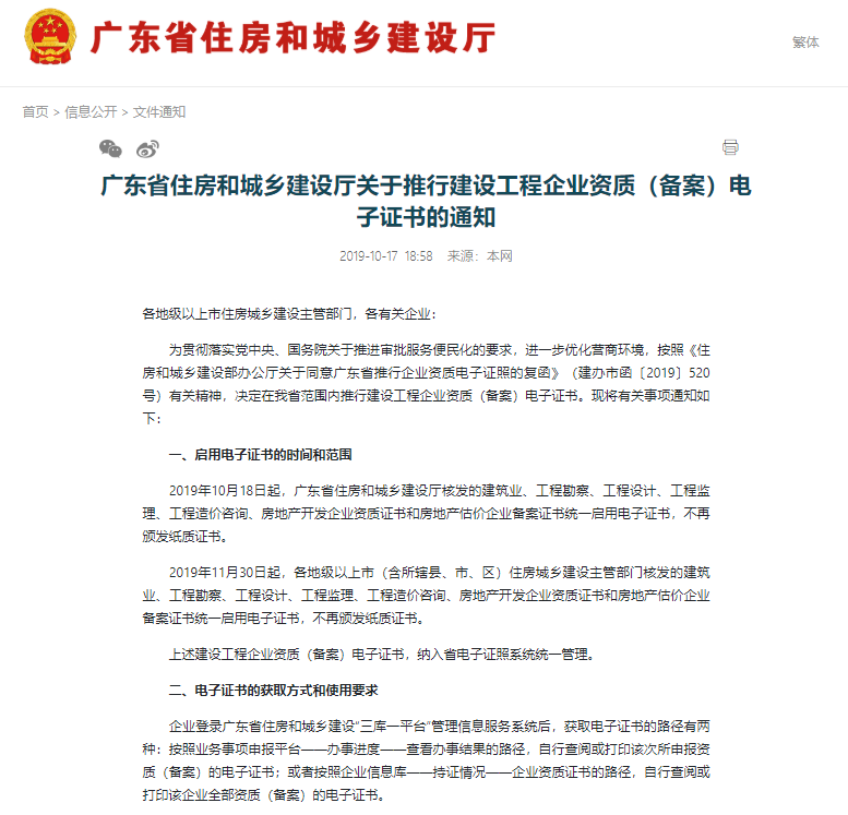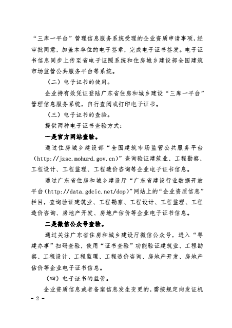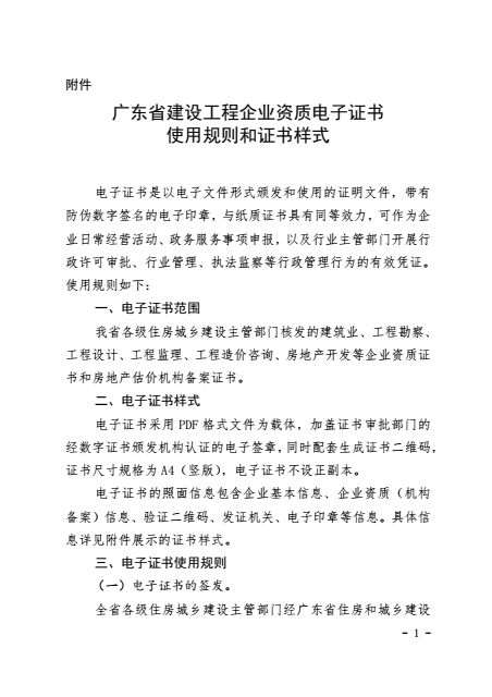 日前,广东省住房和城乡建设厅印发了《广东省住房和城乡建设厅关于推行建设工程企业资质(备案)电子证书的通知》,对启用电子证书的时间和范围、电子证书的获取方式和使用要求及有关要求作出明确指导,通知内容如下: