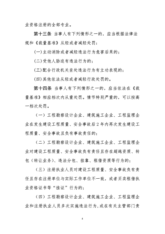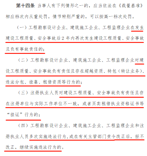 其中,《实施办法》第十四条专门对工程勘察设计企业、建筑施工企业、工程监理企业和注册职业人员涉及建设工程质量、安全事故的违法行为做出了“从重处罚”、“按高一档次处罚”等规定。