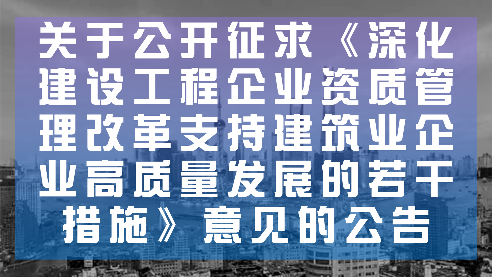 为支持我省建筑业高质量发展,鼓励企业提升综合竞争力,省住房城乡建设厅起草了《深化建设工程企业资质管理改革支持建筑业企业高质量发展的若干措施(公开征求意见稿)》(附件,以下简称《公开征求意见稿》),现公开向社会征求意见,有关事宜公告如下: 一、征求意见时间 2023年3月28日至2023年4月6日。 二、征求意见内容 (一)对《公开征求意见稿》的修改意见。 (二)对《公开征求意见稿》的公平
