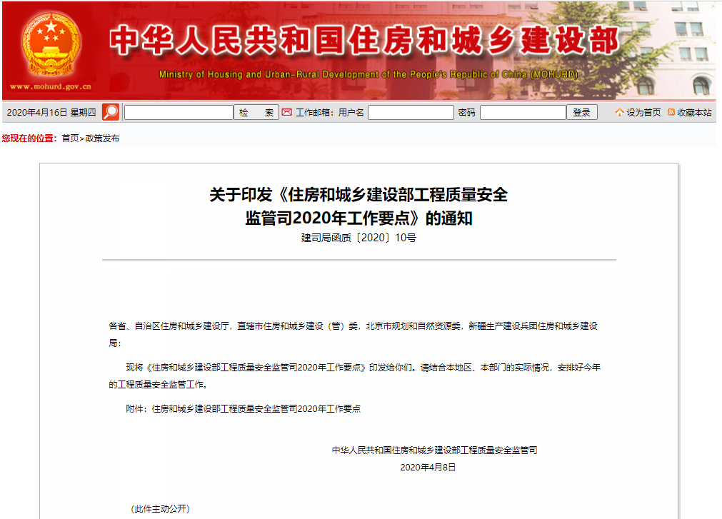 2020年,工程质量安全监管工作以习近平新时代中国特色社会主义思想为指导,全面贯彻党的十九大和十九届二中、三中、四中全会精神,深入贯彻落实习近平总书记对住房和城乡建设工作的重要指示批示精神,坚决贯彻落实党中央、国务院重大决策部署,按照全国住房和城乡建设工作会议部署,以建筑工程品质提升为主线,以建筑施工安全为底线,以技术进步为支撑,统筹做好疫情防控和工程质量安全监管工作,持续完善工程质量安全保障