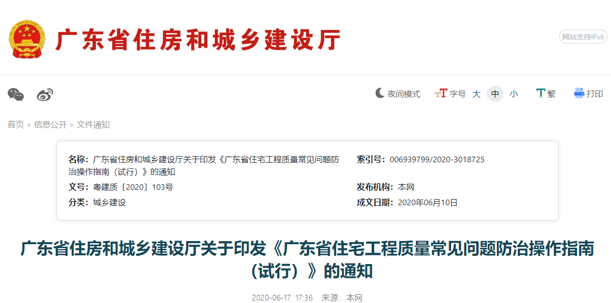 附件下载 广东省住宅工程质量常见问题防治操作指南(试行).doc 相关政策/解读 省住房城乡建设厅印发《广东省住宅工程质量常见问题防治操作指南(试行)》