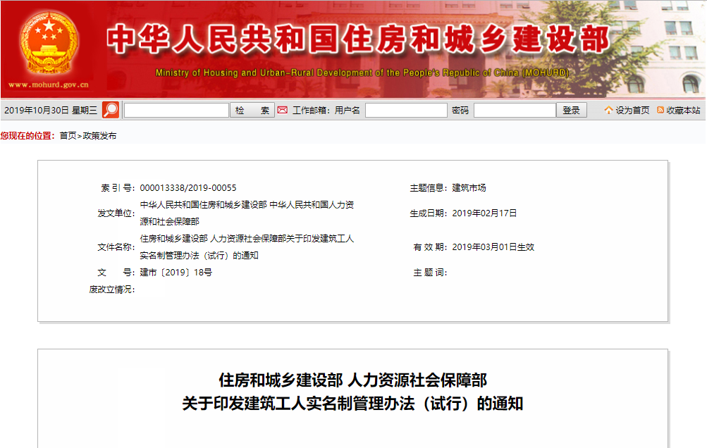 今年2月18日,住房和城乡建设部和人力资源社会保障部联合下发了关于《建筑工人实名制管理办法(试行)》的通知,并于3月1日正式实施。本办法适用于房屋建筑和市政基础设施工程。 政策解读 一、本办法所称建筑工人实名制是指对建筑企业所招用建筑工人的从业、培训、技能和权益保障等以真实身份信息认证方式进行综合管理的制度。 二、建筑工人实名制信息由基本信息、