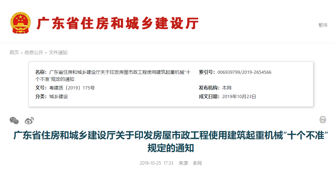 今年以来,广东省住房和城乡建设厅通过专项督查、暗查暗访、委托第三方检验检测机构抽检等方式,对若干在建房屋市政工程使用的建筑起重机械,进行了安全隐患排查。发现相当数量的设备不合格,安全管理风险大。为切实加强对建筑起重机械安装拆卸等危大工程的安全监管,严防安全生产事故发生,广东省住房和城乡建设厅特别制定了《房屋市政工程使用建筑起重机械“十个不准”规定》,予以印发,请有关单位企业
