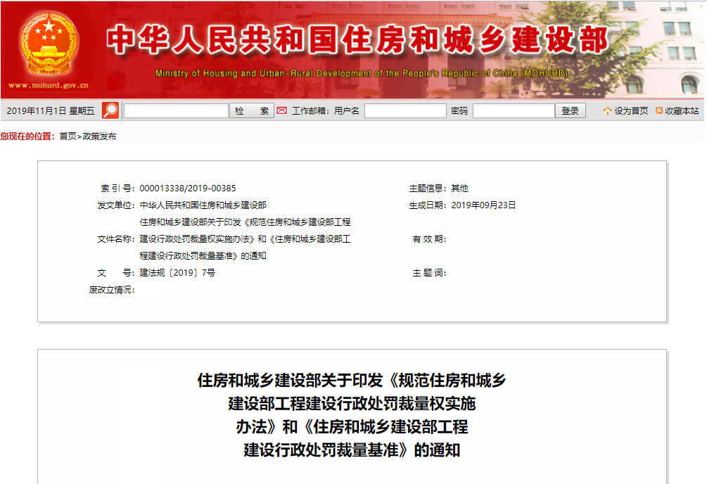 近日,住房和城乡建设部正式印发《规范住房和城乡建设部工程建设行政处罚裁量权实施办法》和《住房和城乡建设部工程建设行政处罚裁量基准》,进一步规范了对工程建设违法行为的行政处罚工作。 该《实施办法》和《裁量基准》自2019年11月1日起施行。 其中,《实施办法》第十四条专门对工程勘察设计企业、建筑施工企业、工程监理企业和注册职业人员