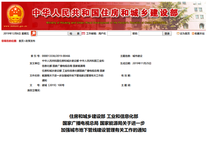 近日,为进一步加强城市地下管线建设管理,保障城市地下管线运营安全,推进城市地下管线集约高效建设和使用,住房和城乡建设部、工业和信息化部、国家广播电视总局和国家能源局近日联合发布《关于进一步加强城市地下管线建设管理有关工作的通知》(以下简称《通知》)。 针对目前地下管线建设管理统筹协调机制不健全、管线信息