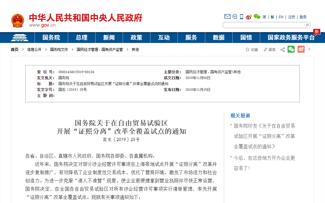 2019年11月15日,国务院发布《国务院关于在自由贸易试验区开展“证照分离”改革全覆盖试点的通知》(国发〔2019〕25号),提出自2019年12月1日起,在上海、广东、天津、福建、辽宁、浙江、河南、湖北、重庆、四川、陕西、海南、山东、江苏、广西、河北、云南、黑龙江等自由贸易试验区,对所有涉企经营许可事项实行全覆盖清单管理,按照直接取消审批、审批改为备案、实行告知承诺、优化审批服务等四种方式分类