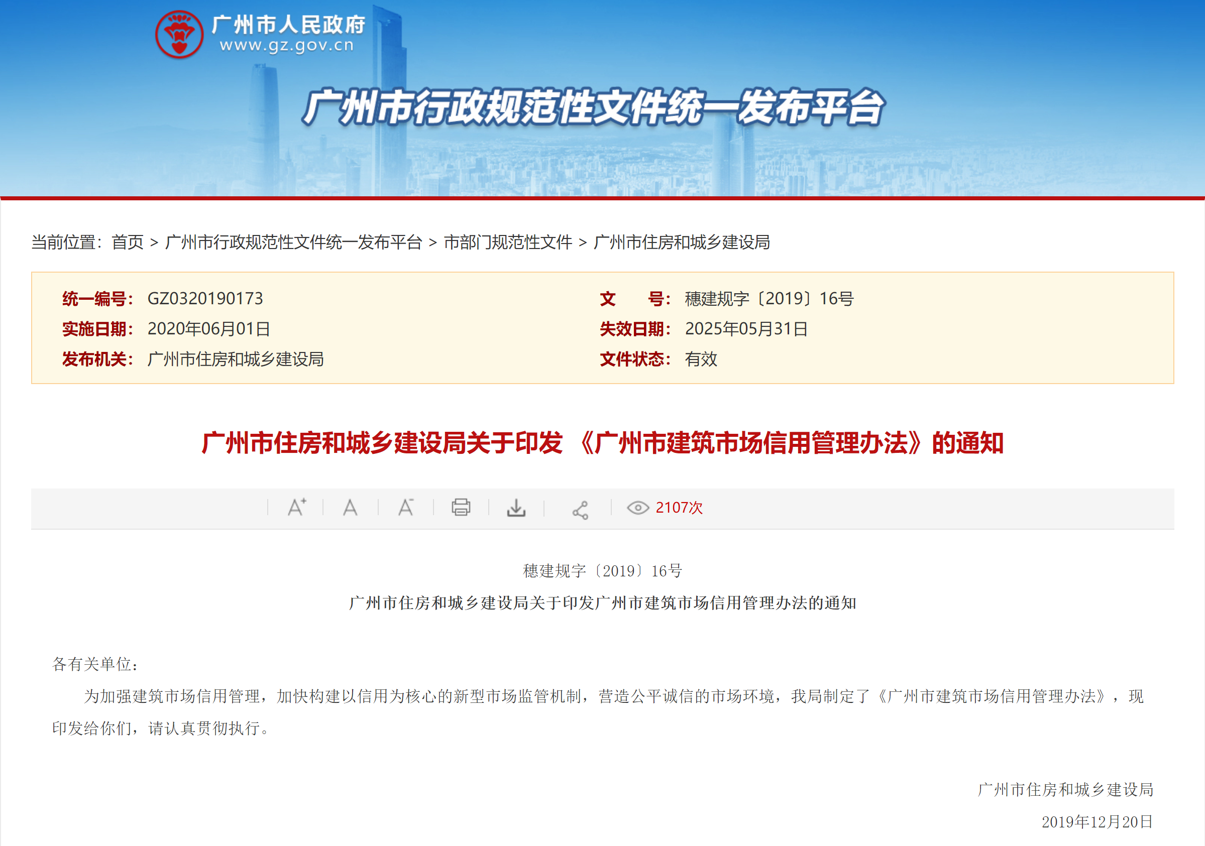 广州市建筑市场信用管理办法 第一条为建立健全建筑市场信用体系,规范全市建筑市场秩序,营造诚实守信的市场环境,根据《中华人民共和国建筑法》、《广东省市场监管条例》、《建筑业企业资质管理规定》、《国务院关于建立完善守信联合激励和失信联合惩戒制度加快推进社会诚信建设的指导意见》(国发〔2016〕33号)、《国务院办公厅关于开展工程建设项目审批制度改革试点的通知》(国办发〔2018〕33号)、《