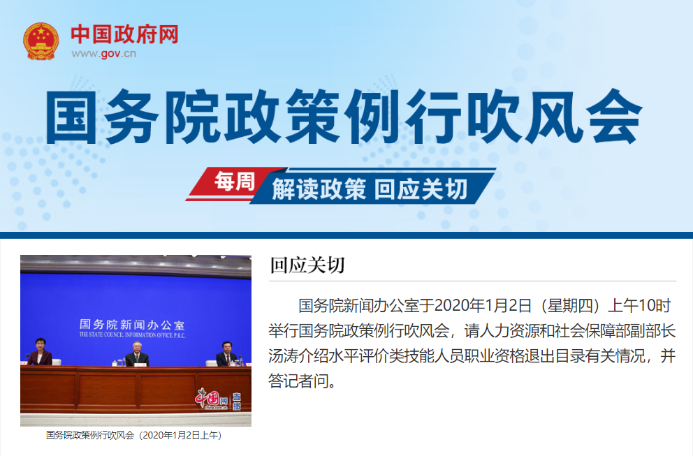 国务院新闻办公室于2020年1月2日举行国务院政策例行吹风会,请人力资源社会保障部副部长汤涛、职业能力建设司司长张立新介绍水平评价类技能人员职业资格退出目录有关情况,并答记者问。 【人力资源社会保障部副部长汤涛进行介绍讲话】 【汤涛】党中央、国务院高度重视职业资格制度改革工作。习近平总书记多次强