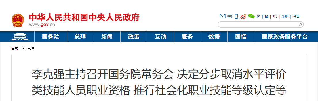 国务院总理李克强12月30日主持召开国务院常务会议,决定分步取消水平评价类技能人员职业资格,推行社会化职业技能等级认定;确定促进社会服务领域商业保险发展的措施,更好满足群众需求;部署推进步行街改造提升,优化商业环境促进消费扩大。 会议指出,按照党中央、国务院部署,深化“放管服”改革,将技能人员水平评