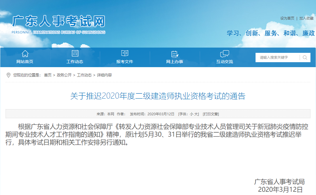 今日,广东人事考试网发布《关于推迟2020年度二级建造师执业资格考试的通告》,通知明确原计划5月30日、5月31日举行的广东省二级建造师执业资格考试推迟举行,具体考试日期和工作安排另行通知。