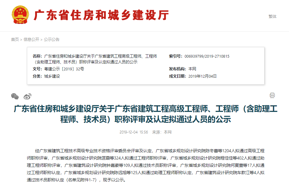 近日,广东省住房和城乡建设厅发布了《关于广东省建筑工程高级工程师、工程师(含助理工程师、技术员)职称评审及认定拟通过人员的公示》的通知。 经广东省建筑工程技术高级专业技术资格评审委员会评审及认定,广东省城乡规划设计研究院陈冬蕾等1204人拟通过高级工程师职称评审,广东省城乡规划设计研究院匡霞等324
