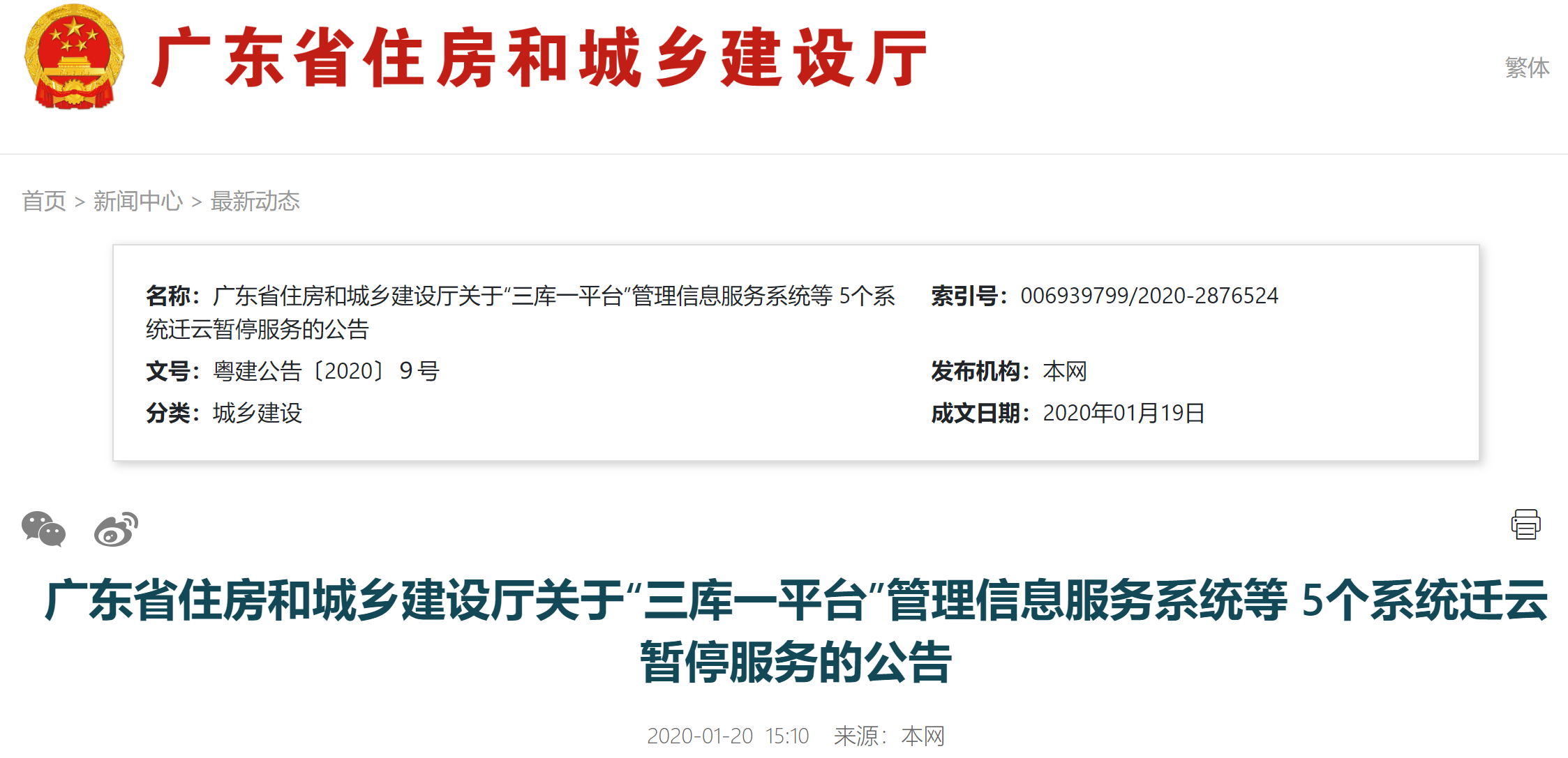 根据《广东省人民政府关于印发广东省“数字政府”建设总体规划(2018-2020年)的通知》(粤府〔2018〕105号)的要求,为推进政务信息系统整合上云工作,经研究,我厅定于2020年1月31日0时至2020年2月5日24时期间,将“三库一平台”管理信息服务系统、广东省建筑市场监管公共服务平台、建设行业信息和技术应用服务平台、进粤企业和人员诚信信息登记平台、清远市建设行业市场监管和诚信管理系统
