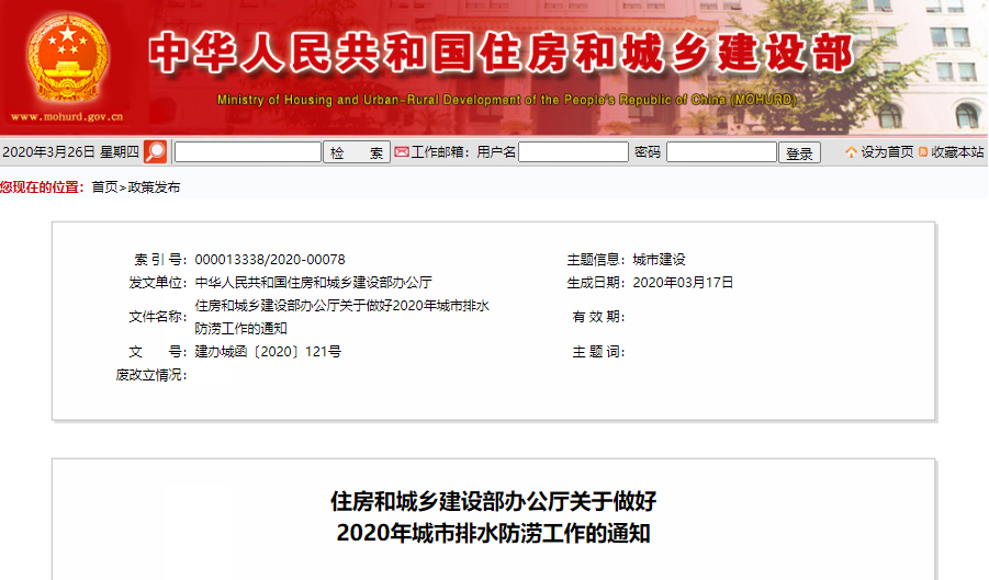 为贯彻习近平总书记在统筹推进新冠肺炎疫情防控和经济社会发展工作部署会议上的重要讲话精神,按照国家防汛抗旱指挥部办公室《关于抓紧做好汛前准备工作的通知》(国汛办电〔2020〕2号)要求,在统筹推进新冠肺炎疫情防控工作的同时,做好城市排水防涝工作,现就有关事项通知如下。 省级住房和城乡建设(水务)主管部门要督促本地区城市落实《住房和城乡建设部关于2020年全国城市排水防涝安全及重要易涝点整
