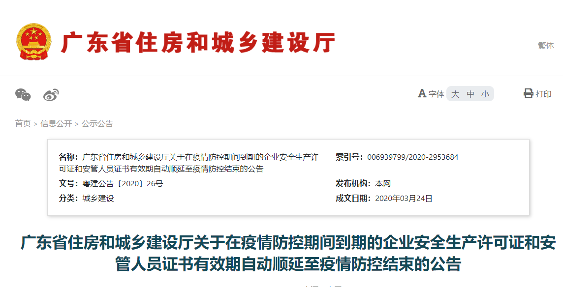 根据《住房和城乡建设部办公厅关于加强新冠肺炎疫情防控期间房屋市政工程开复工质量安全工作的通知》(建办质函〔2020〕106号)要求,结合我省实际,我厅决定将疫情防控期间到期的企业安全生产许可证和企业主要负责人、项目负责人、安全生产管理人员证书有效期自动顺延至疫情防控结束,在此期间相关证书可用于工程招标投标等相关活动。疫情防控期间指的是,从我省启动重大突发公共卫生事件一级响应的1月23日起,直到