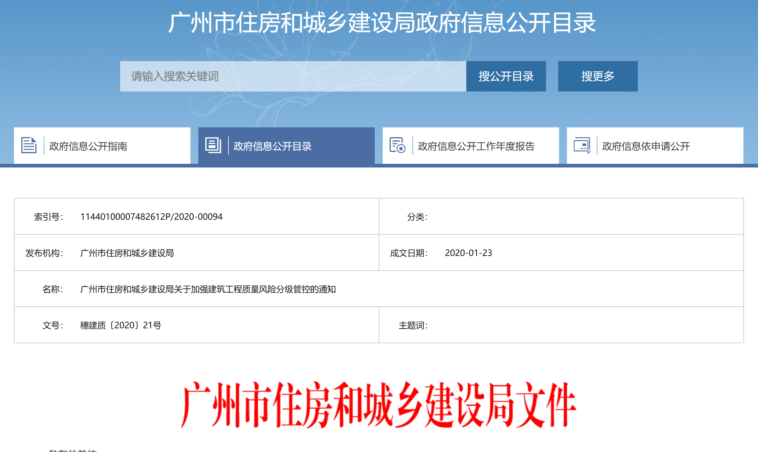 各有关单位: 为贯彻落实市政府《关于印发广州市工程建设项目审批制度改革试点实施方案的通知》(穗府〔2018〕12号)精神,进一步深化“放管服”改革,持续优化营商环境,加强工程质量事中事后监管,规范本市建筑工程质量风险管控工作,提升工程质量预控能力和水平,依据《建设工程质量管理条例》《工程质量安全手册(试行)》及《住房城乡建设部关于印发大型工程技术风险控制要点的通知》(建质函〔2018〕28号)