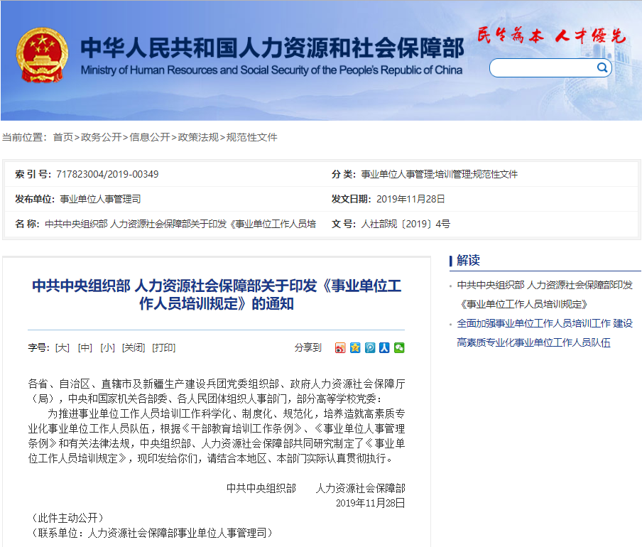 为推进事业单位工作人员培训工作科学化、制度化、规范化,近日,中央组织部、人力资源社会保障部印发《事业单位工作人员培训规定》(以下简称《培训规定》),建立了统一的事业单位工作人员培训制度。 《培训规定》着重强调,坚持将学习贯彻习近平新时代中国特色社会主义思想摆在事业单位工作人员培训最突出的位置,以坚定理想信念宗旨为根本,以全面增强公共服务本领为