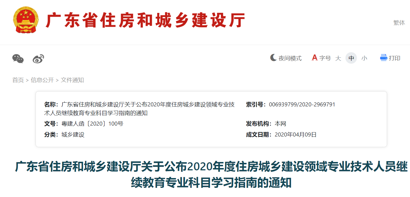 为进一步完善我省住房城乡建设领域专业技术人员的知识结构,提高其专业理论水平、自主创新能力以及综合素养,根据《广东省专业技术人员继续教育条例》和《广东省人力资源和社会保障厅关于进一步做好我省专业技术人员继续教育有关工作的意见》(粤人社规〔2018〕11号)要求,结合本行业实际,现发布2020年度住房城乡建设领域专业技术人员继续教育专业科目学习指南。 围绕省委、省政府和全省住房城乡建设系统