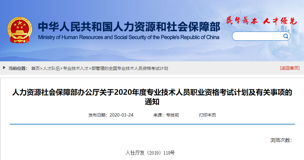 各省、自治区、直辖市及新疆生产建设兵团人力资源社会保障厅(局),各副省级市人力资源社会保障局,国务院各部委、各直属机构人事部门,有关协会、学会: 为进一步做好专业技术人员职业资格考试的规划与管理,便于广大专业技术人员参加职业资格考试,经商有关部门同意,现就2020年度专业技术人员职业资格考试计划及有关问题通知如下: 一、请按照《2020年度专